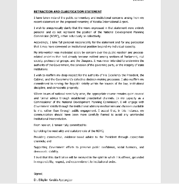 Dr Elikplim Kwabla Apetorgbor, a Commissioner of the National Development Planning Commission (NDPC), has issued a formal retraction and clarification following public and institutional concerns over his earlier comments opposing the proposed renaming of Kotoka International Airport.