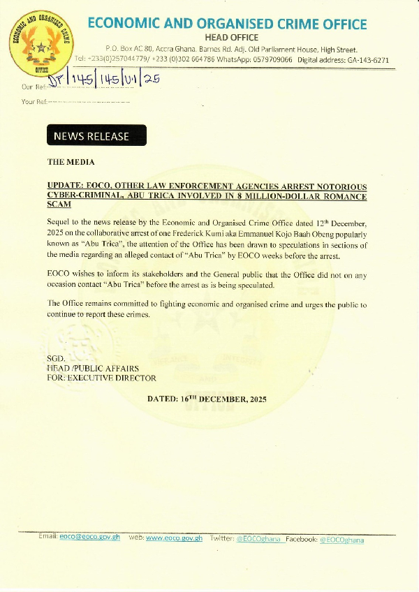 “… The attention of the Office has been drawn to speculations in sections of the media regarding an alleged contact of 'Abu Trica' by EOCO weeks before the arrest.