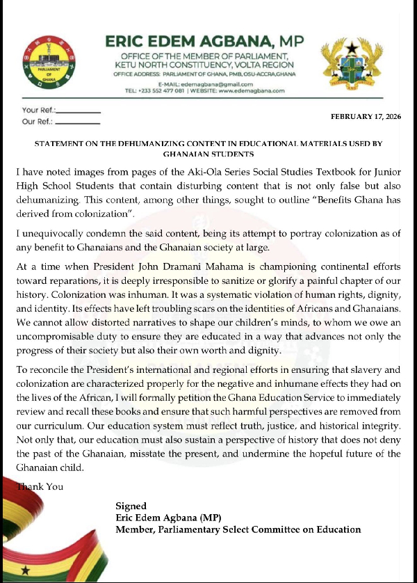 In a statement dated February 17, 2026, the lawmaker, who also serves on Parliament’s Select Committee on Education, said he had come across extracts from the Aki-Ola Series Social Studies textbook that he found troubling.
