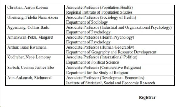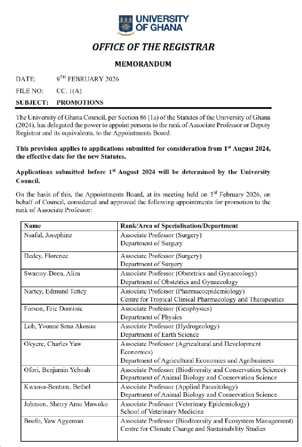 According to a memorandum by the Office of the Registrar of the university, the promotions were effected under Section 86(1a) of the Statutes of the University of Ghana (2024), which empowers the University Council to delegate authority to appoint persons to the rank of Associate Professor, Deputy Registrar, and equivalent positions to the Appointments Board.