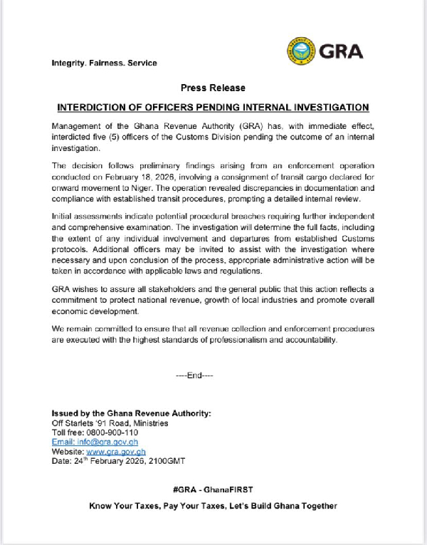 The Ghana Revenue Authority (GRA) has interdicted five officers of its Customs Division with immediate effect as part of an ongoing internal investigation into irregularities uncovered during a recent enforcement operation.