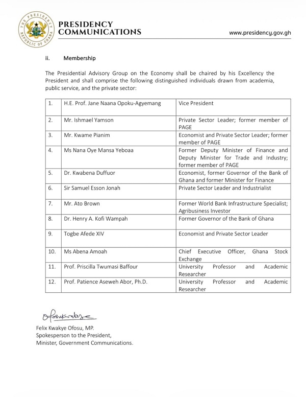 Vice President Professor Jane Naana Opoku-Agyemang is a member of the group, which also includes distinguished economists and private sector leaders such as Kwame Pianim and renowned industrialist Sir Samuel Esson Jonah.