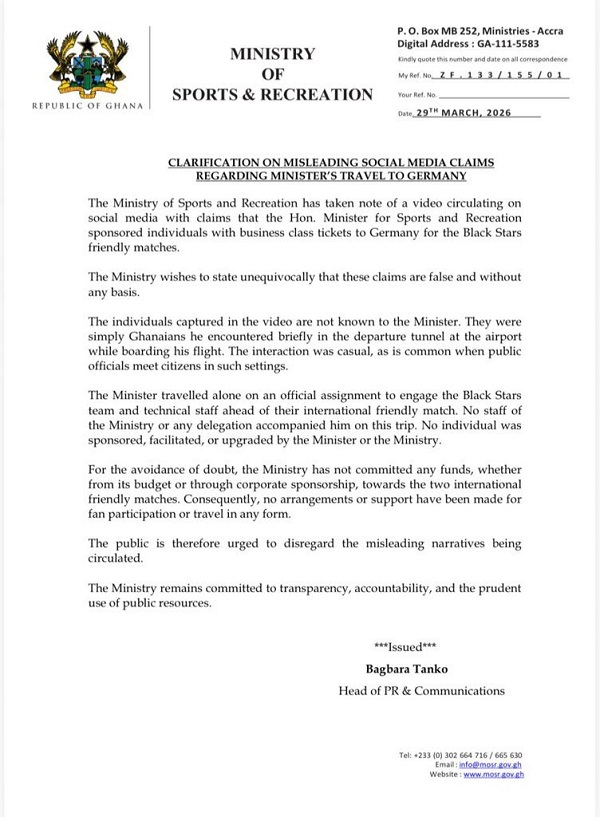 "The Ministry of Sports and Recreation has taken note of a video circulating on social media claiming that the Minister for Sports and Recreation sponsored individuals with business class tickets to Germany for the Black Stars’ friendly matches," the statement read.