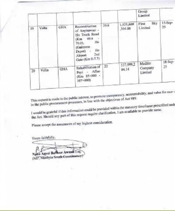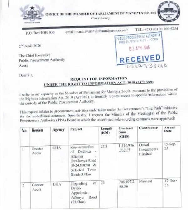 “I write in my capacity as the Member of Parliament for Manhyia South, pursuant to the provisions of the Right to Information Act, 2019 (Act 989), to formally request access to specific information within the custody of the Public Procurement Authority.