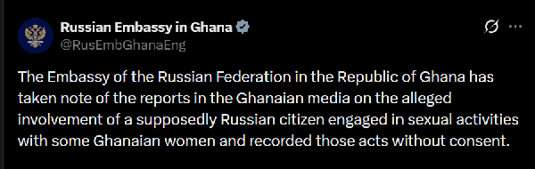 “The Embassy of the Russian Federation in the Republic of Ghana has taken note of the reports in the Ghanaian media on the alleged involvement of a supposedly Russian citizen engaged in sexual activities with some Ghanaian women and recorded those acts without consent,” the statement said.
