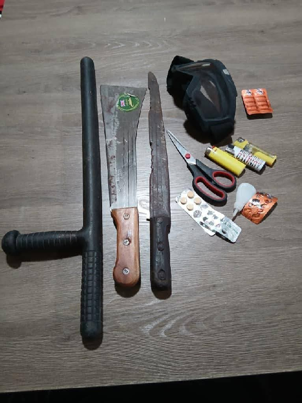 A subsequent search at the residence of suspect Anthony Boateng led to the discovery of several offensive weapons, including a truncheon, a short machete, knives, scissors, lighters and a face shield.
