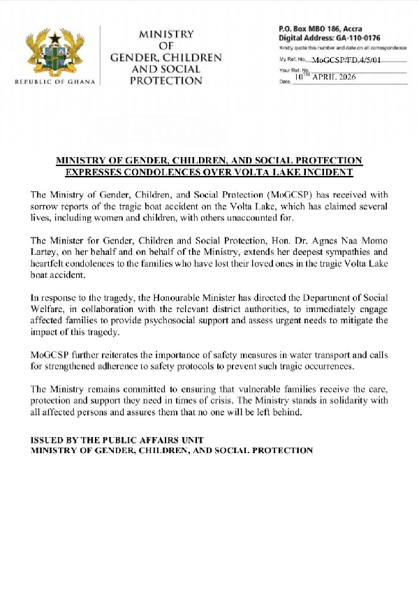 The Ministry of Gender, Children and Social Protection has extended condolences to families affected by the fatal boat disaster on the Volta Lake.