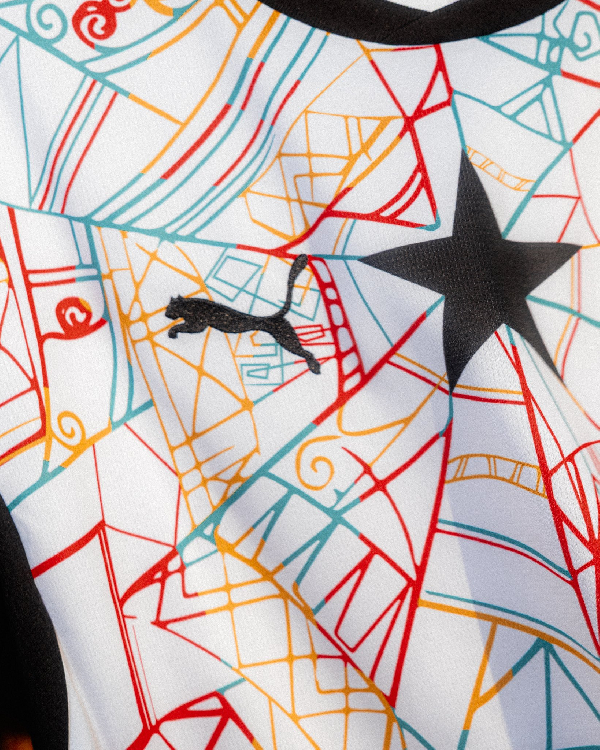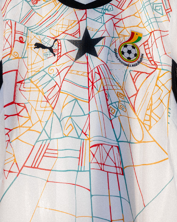 The white jersey also incorporates a black cobweb-like design in the middle, representing the famous Kwaku Ananse motif.