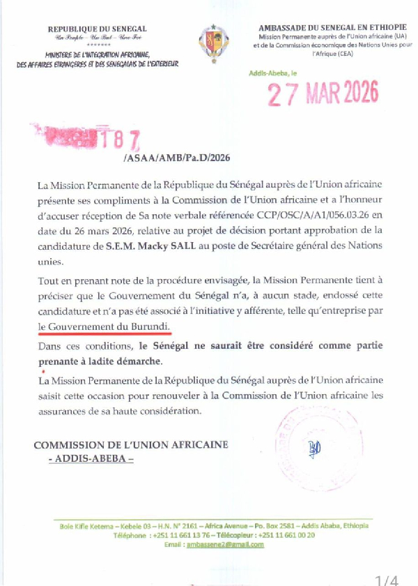 In an official communication dated March 27, 2026, issued from its embassy in Addis Ababa, Senegal clarified that it had not supported the proposed candidacy at any stage.