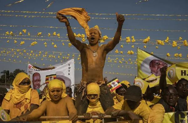 Supporters of Uganda President Yoweri Museveni dey hail for gathering for Museveni first rally afta im nomination by di electoral commission to contest for im seventh term for office for Kololo Ceremonial grounds in Kampala on September 23, 2025.