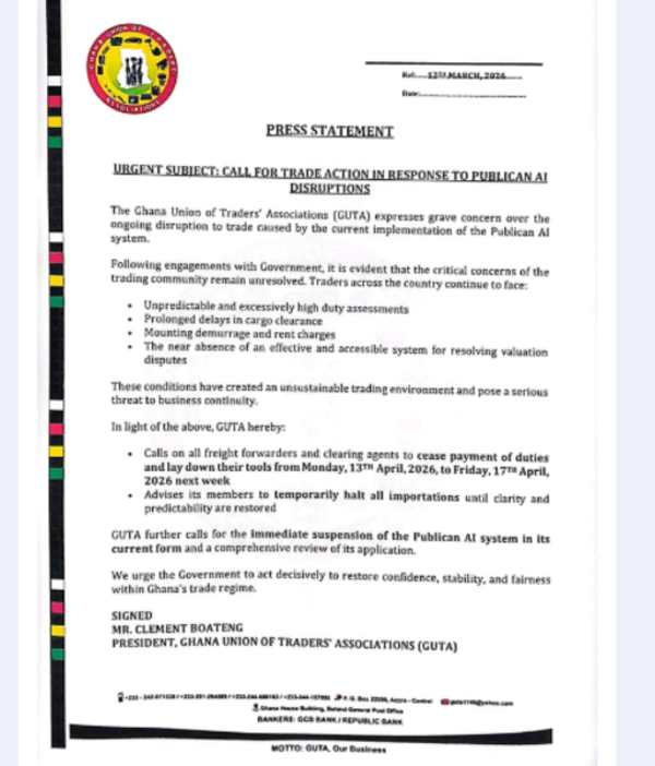The Ghana Union of Traders’ Associations (GUTA) has raised serious concerns over ongoing disruptions in the trade sector, blaming the implementation of the Publican AI system for worsening conditions at the ports and affecting business operations nationwide.