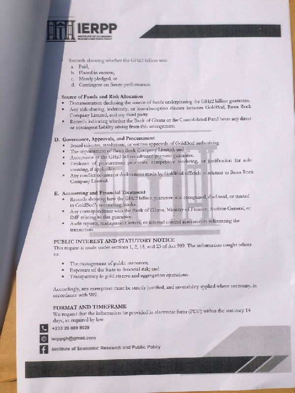 The Institute of Economic Research and Public Policy (IERPP) has formally petitioned the Ghana Gold Board (GoldBod) for full disclosure of documents relating to an alleged GH¢2 billion advance payment guarantee linked to GoldBod’s gold aggregation or trading arrangements.