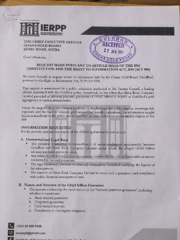 In a detailed request signed by Prof Isaac Boadi, Executive Director of IERPP, on Tuesday, January 27, 2026, and addressed to the Chief Executive Officer of the Ghana Gold Board and grounded in Article 21(1)(f) of the 1992 Constitution and the Right to Information Act, 2019 (Act 989), IERPP said the request was necessitated by a public admission attributed to Sammy Gyamfi, a leading official associated with the GoldBod policy framework.