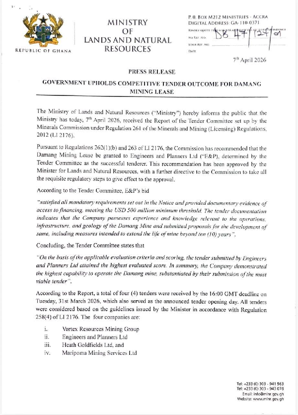 In line with Regulation 263 of the Minerals and Mining (Licensing) Regulations, 2012 (LI 2176), the Tender Committee named Engineers and Planners Limited as the preferred bidder for the Damang Mining Lease and recommended that the Minister for Lands and Natural Resources grant final approval.