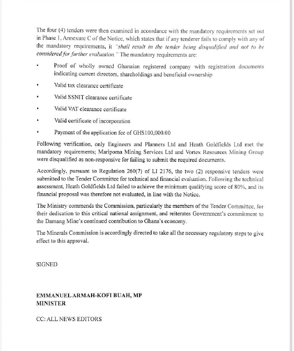 A report from the Tender Committee submitted to the Ministry of Lands and Natural Resources on April 7, 2026, indicates that Heath Goldfields Limited did not meet the minimum technical score required in its bid for the Damang Gold Mine.