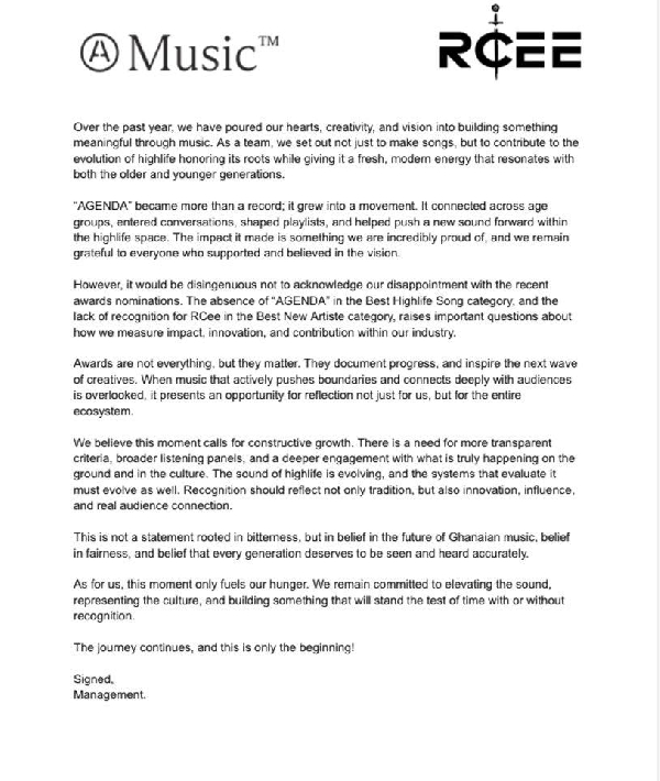 According to the statement, the absence of “Agenda” raises questions about whether the category is being judged solely on traditional benchmarks or if evolving sounds within Highlife are being adequately considered.