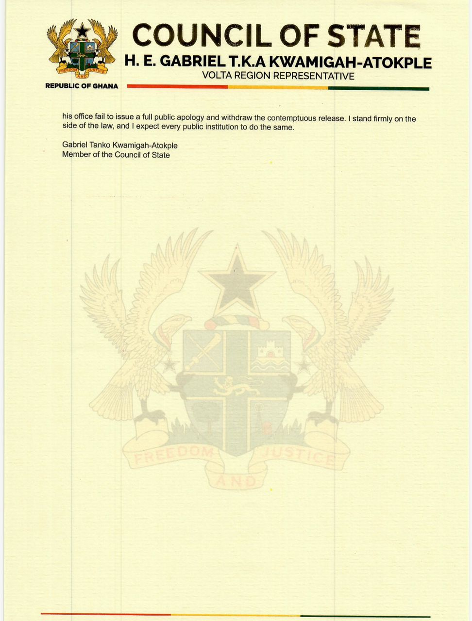 In a strongly worded statement dated March 30, 2026, Kwamigah-Atokple demanded that EOCO’s Acting Executive Director, Raymond Archer, issue an immediate public apology or face legal action.