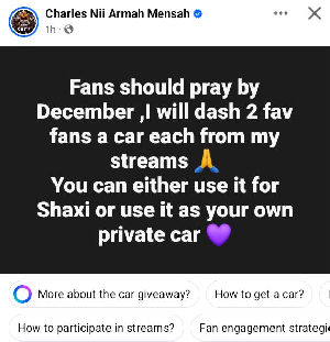 > “Fans should pray. By December, I will dash two fav fans a car each from my streams 🙏. You can either use it for Shaxi or use it as your own private car,” he wrote.
