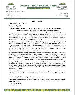 The Agave Traditional Council expresses grave concern over recent developments aimed at undermining the chieftaincy institution in the Agave Traditional Area. This follows the unlawful conduct of a faction to install and outdoor a rival Paramount Chief, despite the existence of a duly designated and sworn-in Paramount Chief who has been officially inducted as President of the Agave Traditional Council and recognized as a member of the Volta Region House of Chiefs.