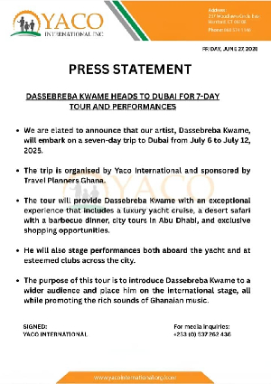 Yaco Entertainment has formally announced that musician Dassebreba Kwame will embark on a tour in the United Arab Emirates from July 6 to July 12, 2025.