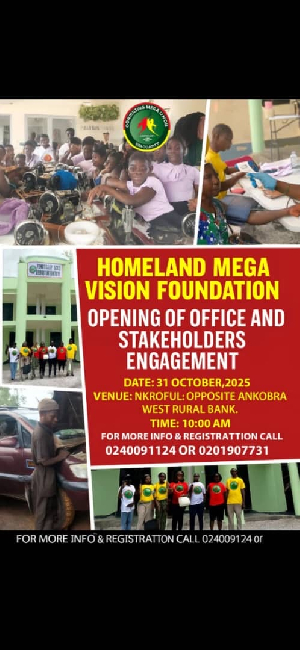 The Homeland Mega Vision Foundation is gearing up to host a major stakeholder engagement and officially open its new operational office at Nkroful on 31st October 2025. The event, scheduled to bring together key stakeholders, will serve as a platform to introduce the foundation’s vision, mission, and development agenda for the Nzema area and beyond.