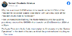 "With only a few days remaining for President Akufo-Addo to turn over, why has a staggering GH₵60 million been transferred to the Office of the President for so-called "Special Operations"?" He asked.