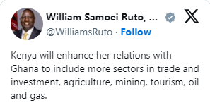By promoting trade, investment, agriculture, mining, tourism, and oil and gas, Kenya plans to deepen its ties with Ghana.