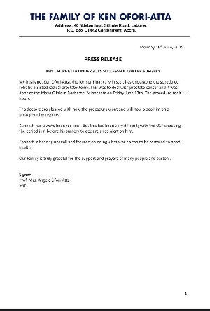 His wife, Prof. Angela Ofori-Atta, noted that the operation went well despite the stress caused by the Special Prosecutor’s red alert issued just days prior.