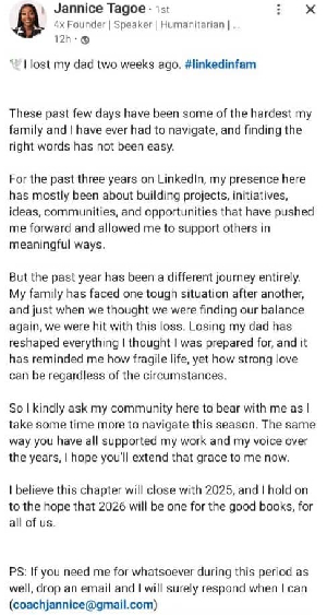 For the past three years, Jannice has used her LinkedIn presence to focus on building initiatives, projects, and communities aimed at empowering others, especially women and young girls. Yet, she shared that the past year had presented a series of difficult personal challenges. "My family has faced one tough situation after another," she revealed, "and just when we thought we were finding our balance again, we were hit with this loss."