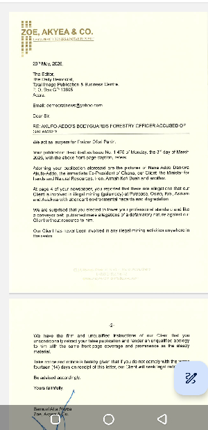 Ofori Panin's lawyers, Zoe, Akyea & Co, sent a letter to the newspaper on May 29, 2025, asserting that the March 3, 2025 publication, captioned "Akufo-Addo's Bodyguards, Forestry Officer Accused of Galamsay," fell short of professional standards by publishing "mere allegations of a defamatory nature."
