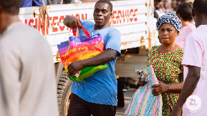 Over 5,000 Ghanaians from far and near gathered at the couple's Accra residence to receive essential food items and drinks.