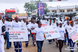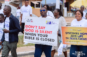 Led by the Jospong Group's Chaplain, Reverend Peter Nelson Adu, and staff members, they defied the morning rains to spread the gospel to residents within Adjirigarnor and its surroundings. They held placards some of which read: "In Him Is Life", "Salvation is Free", "The Lord Has Always Been Faithful", "Jesus Christ is The Salvation" among others.