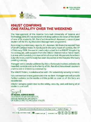 Following the untimely death of Mr. Ransford Amankwah Asomani, a second-year student, Kwame Nkrumah University of Science and Technology (KNUST) has entered a state of mourning. According to reports, early on Sunday, February 8, 2026, Mr. Asomani, who was enrolled in a BSc program in Agribusiness Management, fell from the second story of an off-campus hostel in Ayeduase. With assistance from the KNUST District Police Patrol Team, colleagues hurried the student to the KNUST Hospital, according to a statement released by university administration on Monday, February 9. Nevertheless, he was declared dead upon arrival, despite attempts to save his life.