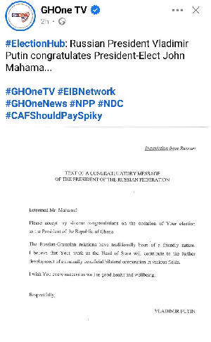 Text of the Russian Federation President's Congratulatory Message Distinguished Mr. Mahama! I would like to extend my heartfelt congratulations on your election as the Republic of Ghana's president. Historically, relations between Ghana and Russia have been cordial. As Head of State, I think your efforts will help advance bilateral cooperation that benefits both parties in a number of areas.