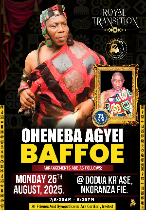 The Nkoranzaman Traditional Council has officially announced that the one-week observation for the late Oheneba Agyei Baffoe, the Ankobiahene of Nkoranzaman, a revered figure also widely known as Kwabena Adjei-Mensah, will be held on Monday, August 25, 2025. The solemn event is scheduled to take place at Dodua Kr'Ase, Nkoranza fie, within the Nkoranza traditional area.