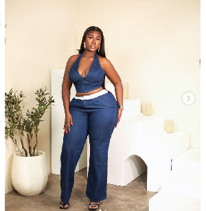 In a previous picture shoot, Hajia Bintu also looked effortlessly elegant in a chic halter-neck crop top and matching denim jeans. The young CEO posed flirtatiously for the camera while sporting a lengthy haircut that hung down to her back in a center-parted frontal lace.
