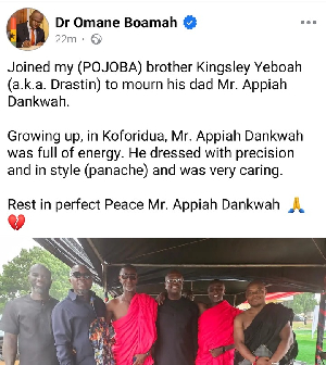 Newly appointed Defence Minister and prominent member of the National Democratic Congress, Dr. Edward Omane Boamah, has joined fellow Pope John Old Boys Association (POJOBA) member, Kingsley Yeboah, also known as Drastin, to mourn the passing of Mr. Appiah Dankwah.