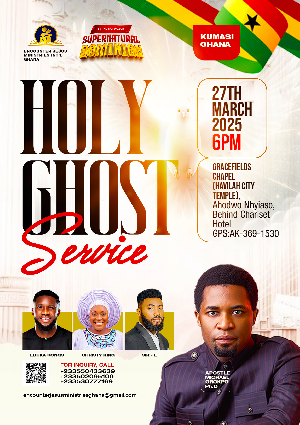 The Holy Ghost service is happening on Thursday, 27th of March, 2025 at the Gracefields Havila Chapel, Ahodwo Kumasi at 6pm