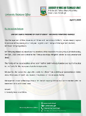 The University of Mines and Technology (UMaT), Tarkwa, has officially announced the passing of Mr. Davis Frimpong-Manso, a third-year student of Logistics and Transport Management, in a statement released on Friday, April 11, 2025.