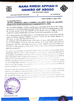 In a statement signed by Abosso Chief Nana Kwesi Appiah, the traditional authorities cautioned politicians suspected of supporting illegal miners to stay away from their lands.