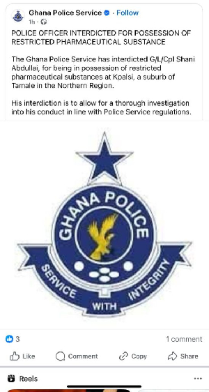 The Ghana Police Service has arrested G/L/Cpl Shani Abdullai for possessing restricted medicinal substances in Kpalsi, a neighborhood of Tamale in the Northern Region.