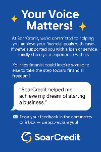 SoarCredit is a trusted financial support company dedicated to helping individuals and businesses achieve their goals through flexible loans, credit support, and financial advisory services.